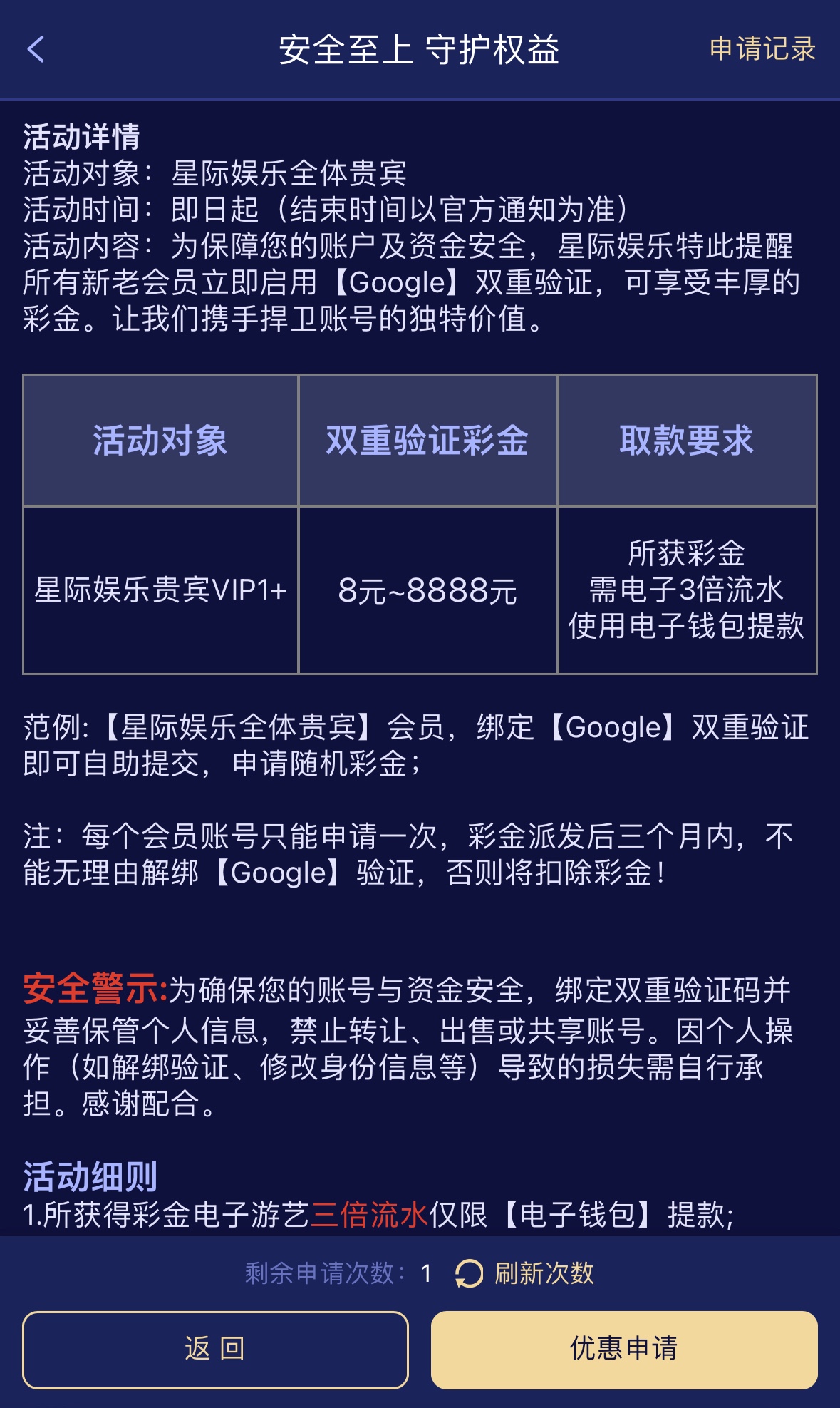 要求VIP1以上的,彩金3倍流水,仅限:电子钱包取款,符合条件会弄的兄弟可以去整一下这个彩金