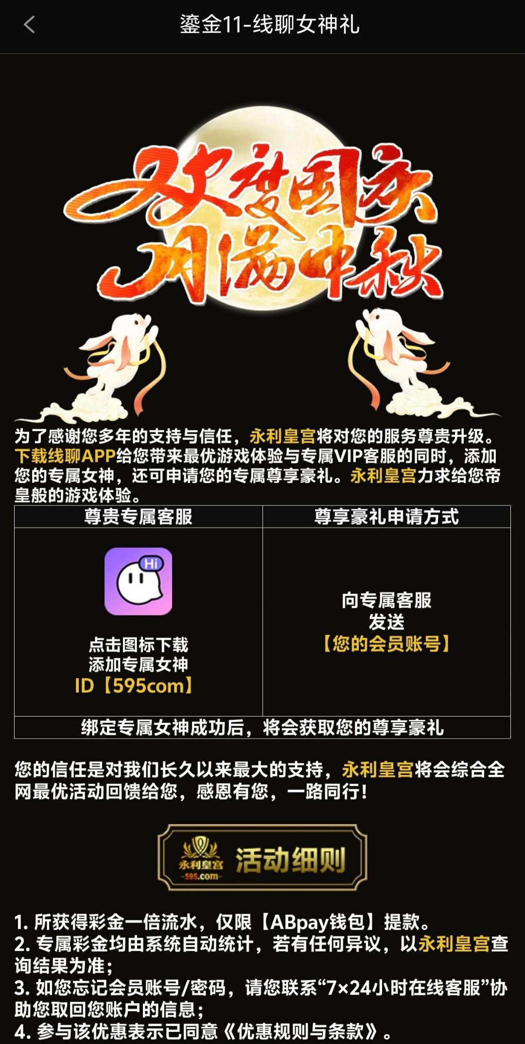 近期有充值过100的哥们可以去线聊APP联系专员领取彩金